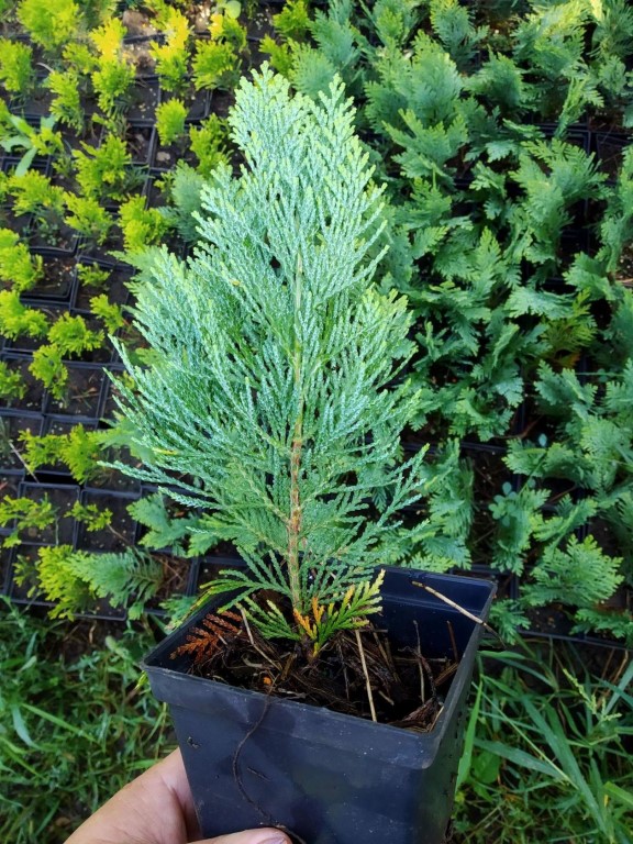 Кипарисовик Лавсона Колумнарис Это растение родом из Северной Америки. Выведен сорт Колумнарис голландскими селекционерами в 1941 году. В Европе культура появилась сравнительно недавно, но довольно быстро завоевала популярность. Саженцы многолетника приобретают и выращивают как садоводы-любители, так и профессионалы. Ботаническое описание По внешнему виду это прямоствольное хвойное дерево, с очень декоративными качествами. Крона у него узкая, колонновидная, диаметром до 2 м. В высоту представленные на фото саженцы достигают 5 – 10 м (в возрасте 10 лет). Побеги тонкие, тугие, направленные вверх. Ветви короткие, густо и равномерно размещённые, длиной около 10 см. Они прочно прижаты к побегу и покрыты коричнево-зелёной корой. Растёт кипарисовик Лавсона Колумнарис довольно быстро: годичный прирост составляет 20 см. Хвоя серо-голубого окраса, чешуйчатая. Корневая система мощная, обильно разветвлённая. В большей части она состоит из придаточных корней. Благодаря такому строению саженцы надёжно закрепляются в почве, хотя и нуждаются в ветрозащите. Применение Кипарисовик Лавсона Колумнарис – великолепный сорт для создания зелёной живой изгороди. Он хорошо переносит обрезку и формирующую стрижку. Выращенную в питомнике рассаду можно размещать группой, создавая эффектный фон для других лиственных кустарников и хвойников. Также многолетник отлично смотрится в качестве солитера на газоне или большой клумбе в окружении пёстрых цветов. Также кипарисовик Лавсона Колумнарис используют как: покровное растение; для колористических композиций; для неформированных шпалер; для озеленения городских территорий (парки, сады, скверы); для рабаток; для скальных палисадников; для украшения откосов. Некоторые дачники выращивают хвойник в комнатных условиях, помещая саженцы в контейнеры и горшки. Агротехника Для посадки кипарисовика Лавсона Колумнарис рекомендуется выбирать хорошо прогреваемые и освещённые места. Желательно, чтобы они были защищены от сильного ветра. В идеале – это небольшая возвышенность с низким прохождением грунтовых вод. Почва на участке нужна умеренно-влажная, плодородная, лёгкая по структуре и воздухопроницаемая. Интервал между представленными на фото саженцами устанавливается исходя из желаемой композиции. Например, для живой изгороди расстояние делают меньше, чтобы растения росли сгруппировано. В остальных случаях дистанцию оставляют больше, чтобы взрослые экземпляры не затеняли друг друга. На дно посадочной лунки укладывается дренаж из битого кирпича, мелкой гальки, щебеня или керамзита. Растение опускается внутрь вместе с комом земли. При этом корневая шейка должна размещаться на уровне поверхности земли. После высадки потребуется щедрый полив и мульчирование приствольных кругов торфом. Это поможет сократить испарение влаги и предотвратит перегрев корневой системы. В дальнейшем водные процедуры выполняются каждую неделю. Расход жидкости – по 1 ведру на каждый саженец. В засушливый период показано дождевание кроны. Подкормки вносят в начале лета или весной. Для этого используют специальные препараты, предназначенные для хвойных растений. Молодую рассаду кипарисовика Лавсона Колумнарис можно подкормить через 2 месяца после высадки. Также уход за растениями включает санитарную и формирующую стрижку. На 